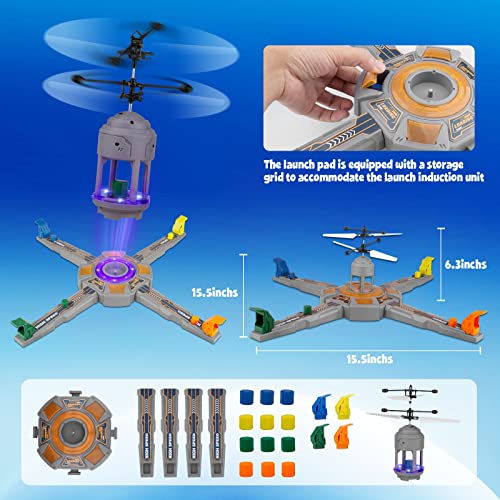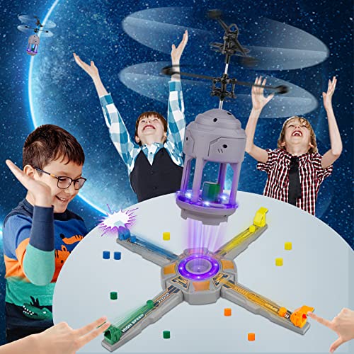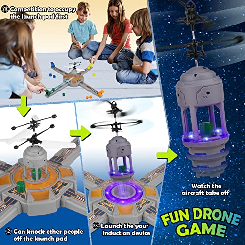 ✈️【MULTIPLAYER COMPETITIVE INTERACTION TOY DRONE】The drone game has 4 launch tracks and 4 colors of launch sensing devices that emit bright blue light when it is turned on. You can open multiplayer competition mode with family and friends, and take the lead in transmitting the sensing device to the sensor, and successfully realize the take-off of the man-machine.Competitive feeling!The kids toy is great for multiplayer,kids,teens and adults will love it!