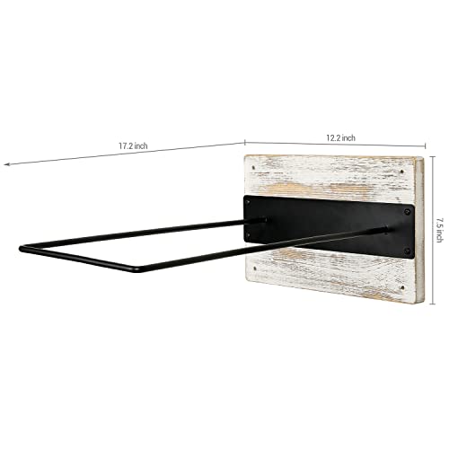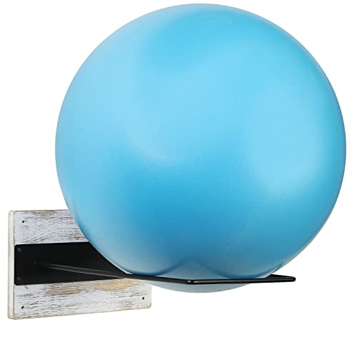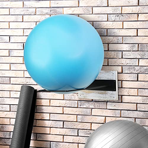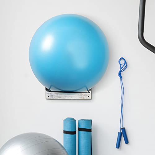 Keep your exercise and sports balls stylishly organized with this wall mounted whitewashed wood and black metal storage rack. Create more floor space and keep your sports balls from rolling around your gym, studio, fitness center, garage, home or shed. Simply mount to most wall surfaces with the proper hardware to easily store and conveniently access your exercise balls. The long black metal rectangular frame provides plenty of space to hold larger exercise, stability balls, or yoga balls, or can store up to 2 sports balls, such as basketballs, soccer balls, or volley balls, at a time. Keep your space neat and tidy while bringing in shabby chic industrial style with this black metal and white washed wood wall mounted ball storage holder.