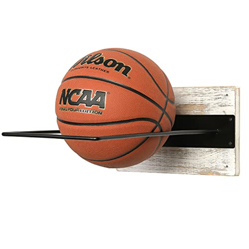 Wall mounted black metal and whitewashed wood large sports ball storage rack brings rustic and industrial style and organization to your exercise space