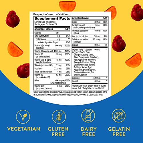 Formulated with the full B-vitamin complex to help convert food into fuel.* 15 vitamins and minerals, including vitamin A, vitamin C, vitamin D3, vitamin E, biotin, zinc and food-based Orchard Fruits & Garden Veggies powder blend (100 mg per serving).